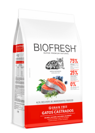 Biofresh Súper Premium para Gatos Castrados es un alimento libre de granos, completo y balanceado, especialmente formulado para carnívoros por su alto contenido proteico y bajo contenido de carbohidratos. Biofresh para Gatos Castrados está diseñado para mantener el peso ideal, reducido en grasas y calorías, con L-carnitina para la correcta metabolización de las grasas y mantención de la masa muscular. Ingredientes de alta calidad, frescos, principalmente de origen animal que cuidan la salud de piel y pelaje, mantienen el correcto funcionamiento intestinal, estimulan el sistema inmunológico, protegen la salud dental y previenen enfermedades del tracto urinario. Con moduladores fecales para la formación de heces firmes y olor reducido. Adicionado con taurina extra para un correcto funcionamiento del músculo cardiaco, sistema digestivo y visión. Altamente palatable, diseñado para una óptima salud en gatos castrados.
